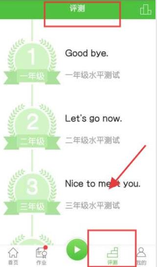 2、評(píng)測(cè)頁(yè)面提供一至三年級(jí)英語(yǔ)水平測(cè)試,如Good、bye等語(yǔ)句,幫助用戶了解自身英語(yǔ)水平。