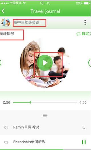 3、播放頁(yè)面呈現(xiàn)Travel journal內(nèi)容,針對(duì)高中三年級(jí)英語(yǔ)有單詞聽(tīng)說(shuō)訓(xùn)練,支持循環(huán)播放與自定義設(shè)置。