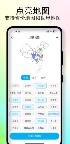 3、地圖標記與分享:用戶可以通過勾選已經訪問過的地方,在地圖上生成標記,并制作分享海報。