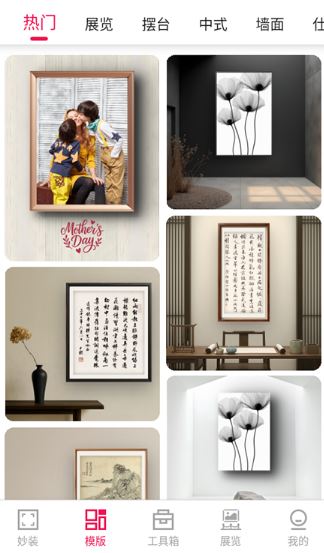 2、在底部菜單欄點(diǎn)擊“模版”,瀏覽“展覽”“擺臺(tái)”“中式”等分類(lèi),點(diǎn)擊心儀畫(huà)框加同款。
