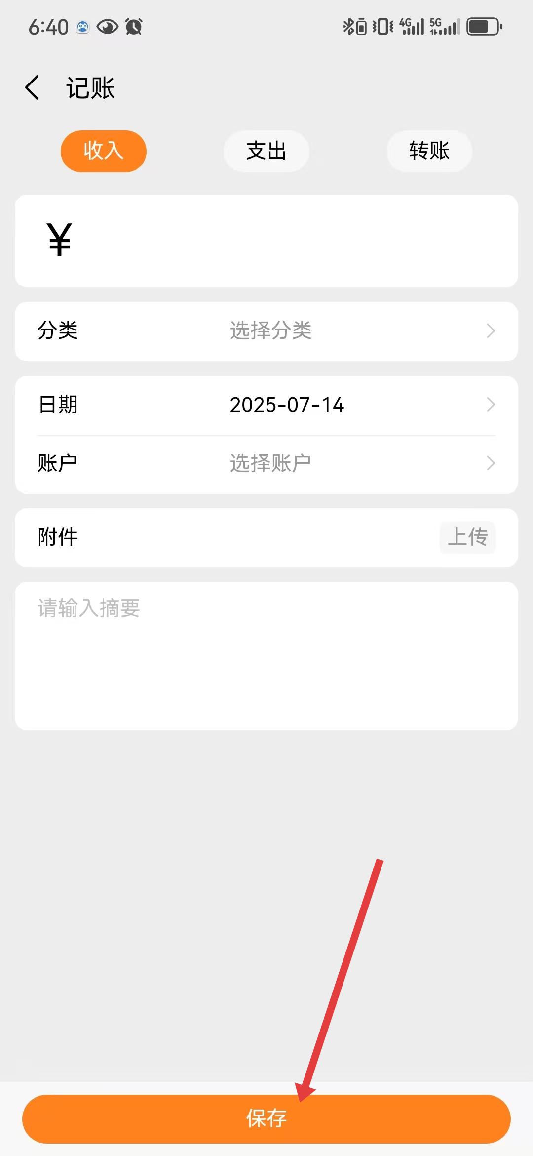 2、進(jìn)入APP的記賬錄入頁,保存按鈕是記錄收支的關(guān)鍵一步,在選定收支或轉(zhuǎn)賬類型和填好內(nèi)容后,按需上傳附件、寫摘要后,點(diǎn)擊保存即可將這筆賬務(wù)信息存入系統(tǒng)。