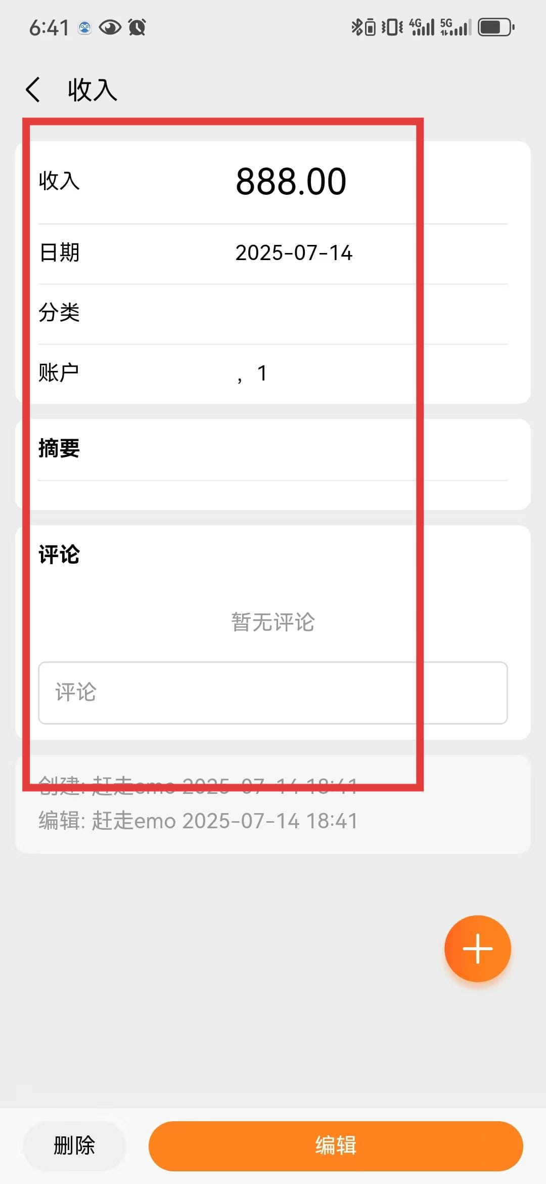 3、接著進(jìn)入APP的收入詳情頁,紅框內(nèi)呈現(xiàn)該筆收入的核心信息,它用于集中展示收入記錄的完整內(nèi)容,方便用戶核對、回顧每筆收入的具體情況,助力清晰梳理財務(wù)信息。