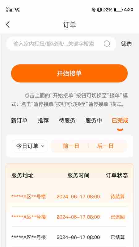 支持用戶實(shí)現(xiàn)一鍵接單,輕松開啟自己的接單模式,篩選新訂單來(lái)進(jìn)行接單。