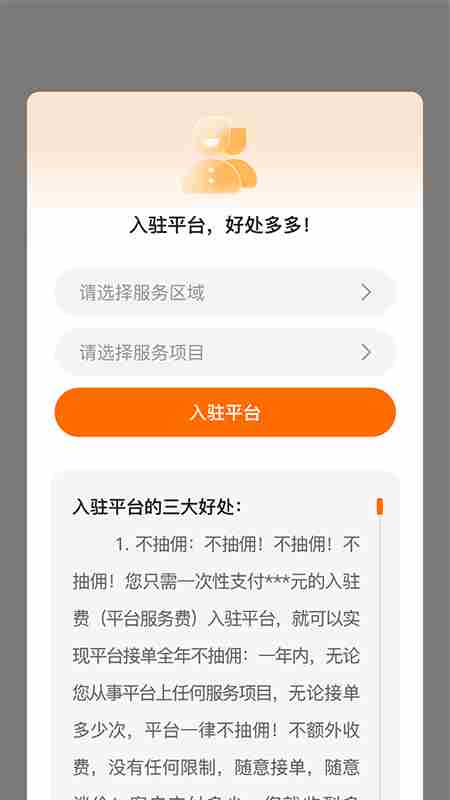 1、打開應(yīng)用就可以選擇服務(wù)區(qū)域和服務(wù)項(xiàng)目來(lái)入駐平臺(tái),輕松入駐。
