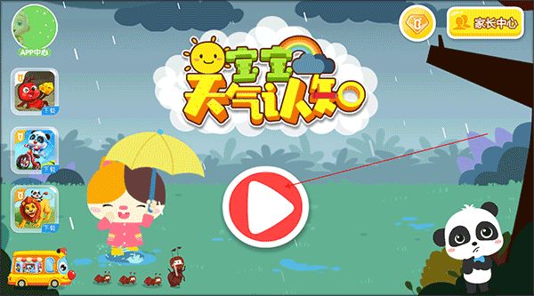 1、進(jìn)入寶寶天氣認(rèn)知官方版后,點擊中間的三角形就可以開始學(xué)習(xí)天氣知識啦!
