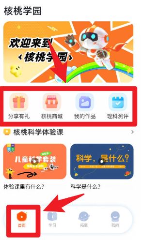 2、在首頁功能區(qū),用戶能夠進(jìn)入核桃商城、分享有禮、我的作品和理科測評等版塊,同時(shí)還能瀏覽推薦的學(xué)習(xí)內(nèi)容,全面掌握學(xué)習(xí)資源。