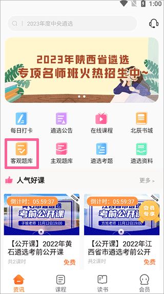 1、首先,打開軟件,在資訊頁(yè)面找到并點(diǎn)擊“客觀題庫(kù)”按鍵。