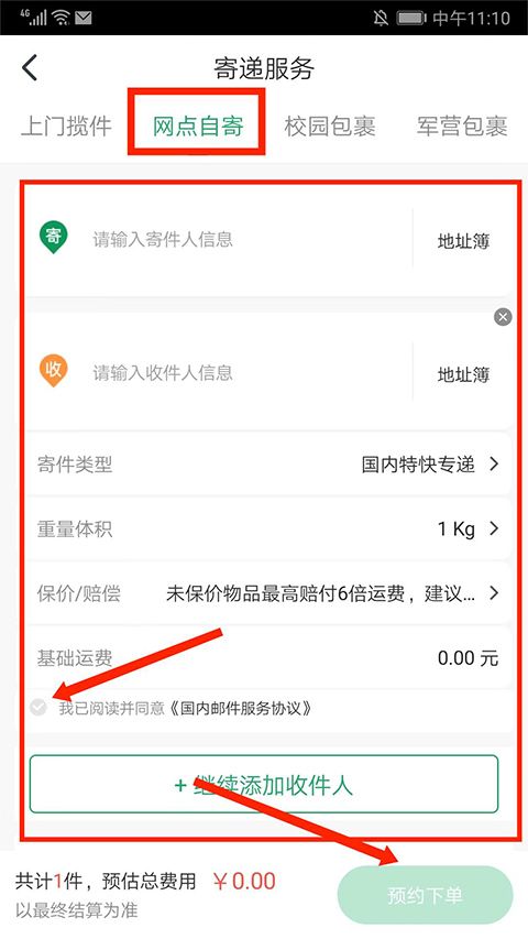 4、選擇“網點自寄”,首先填寫好“寄件人地址”和“收件人地址”,選擇“寄件類型”、“重量體積”和“保價/賠償”服務,勾選“閱讀并同意”選項,最后選擇“預約下單”選項,