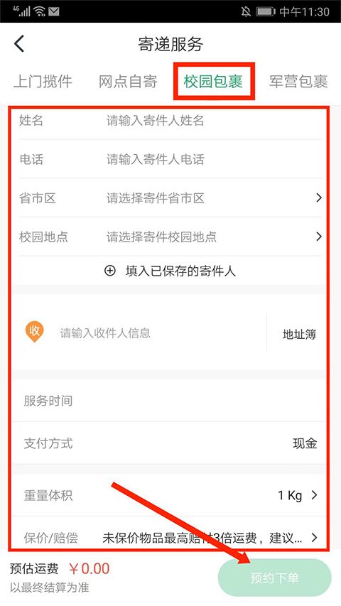 5、選擇“校園包裹”,首先填寫好寄件人“姓名”、“電話”、“省市區(qū)”、“校園地點”和“收件人信息”,然后填寫重量體積”和“保價/賠償”服務,最后選擇“預約下單”選項,