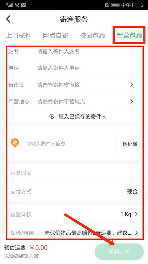 6、選擇“軍營包裹”,首先填寫好寄件人“姓名”、“電話”、“省市區(qū)”、“軍營地點”和“收件人信息”,然后填寫重量體積”和“保價/賠償”服務,最后選擇“預約下單”選項,用戶可根據(jù)自己的需求選擇相應的寄件服務即可。