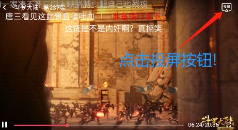 2、在視頻播放界面,點(diǎn)擊右上角【投屏】按鈕,在選項(xiàng)頁面中點(diǎn)擊【投屏】按鈕;