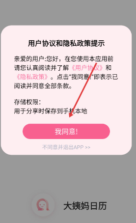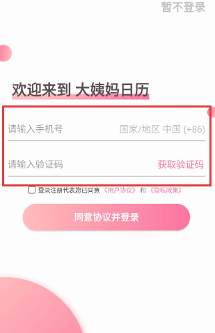 1、使用前閱讀用戶協(xié)議,了解隱私政策,同意后進入登錄,填手機號驗證碼,管理經(jīng)期。
