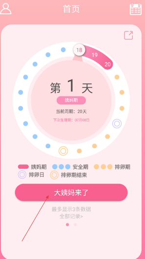 3、進入首頁,點大姨媽來了,標(biāo)記經(jīng)期,看安全、排卵周期,輔助生理健康管理。