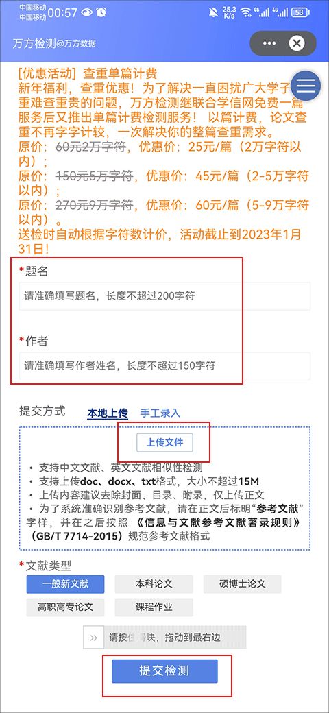 2、進(jìn)入后,將論文題目,作者,文件填寫或上傳后,并點(diǎn)擊提交檢測(cè)。