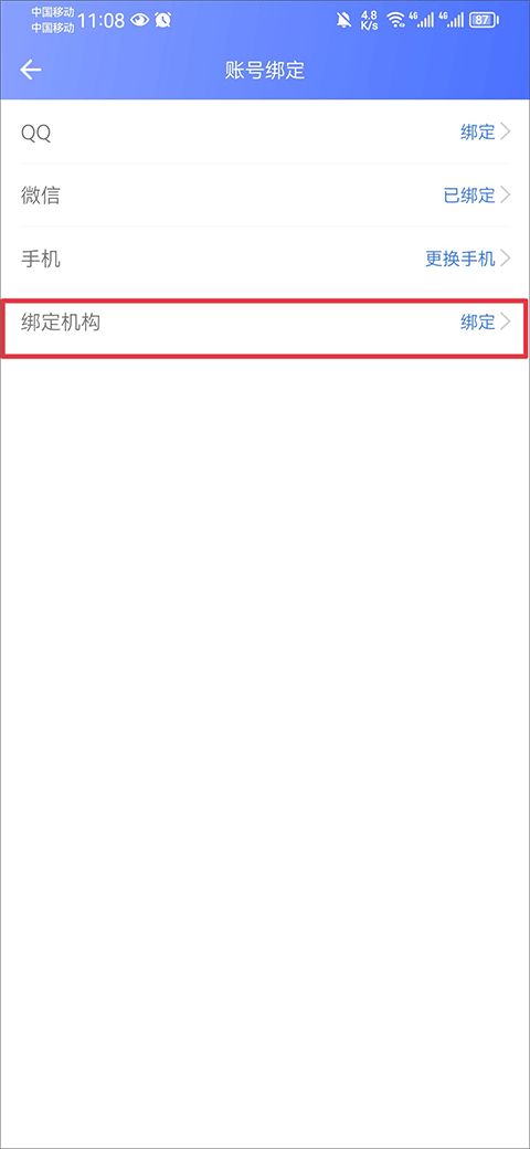 4、接著在賬號(hào)綁定界面中點(diǎn)擊綁定機(jī)構(gòu)。