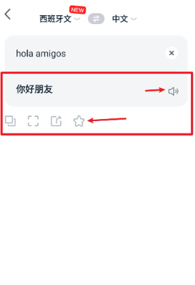 3、翻譯完成后可看到對(duì)應(yīng)結(jié)果,可點(diǎn)擊右側(cè)喇叭圖標(biāo)播放發(fā)音,或點(diǎn)擊星號(hào)收藏該條翻譯。