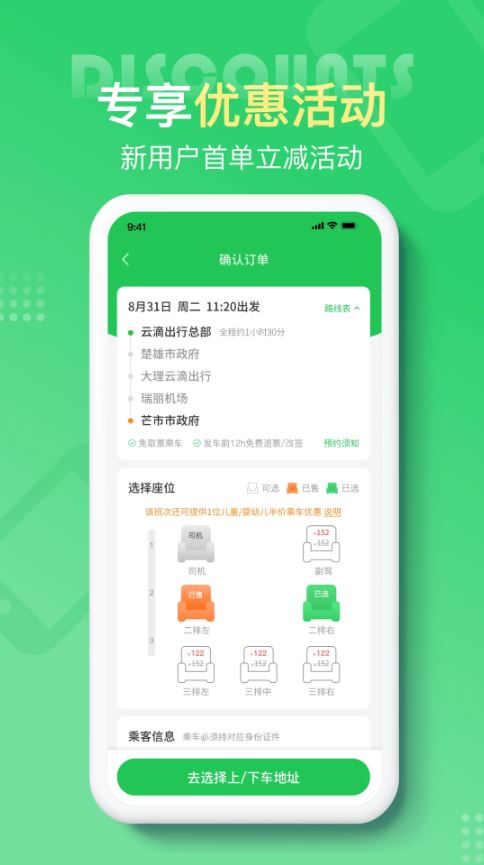2、在線實時預約出行,想什么時候出行,預約時間,優(yōu)惠約車費用,手機支付也方便。