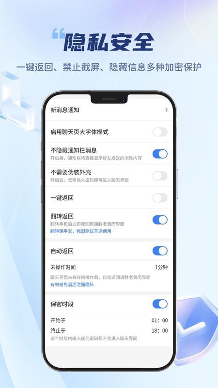 2、快捷防護(hù):提供翻轉(zhuǎn)返回、一鍵返回等快捷操作,遇到突發(fā)情況可立即退出隱私模式。