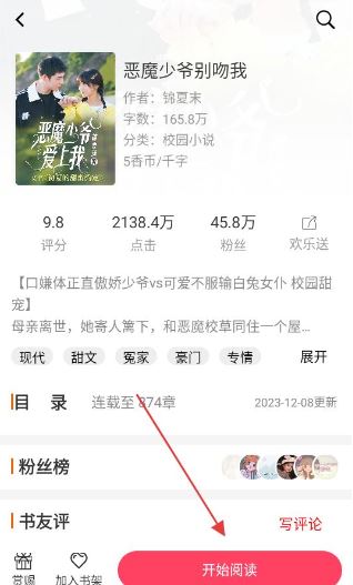 3、選中想讀的小說,進入詳情頁,查看評分、點擊量等信息后,點擊開始閱讀,沉浸式體驗小說內(nèi)容。