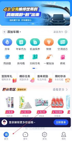 3、首頁,有促銷活動,提供洗車、年審代辦等多種養(yǎng)車服務(wù),還有簽到有禮、限時秒殺等福利活動,用戶可添加車輛并享受相關(guān)服務(wù)。