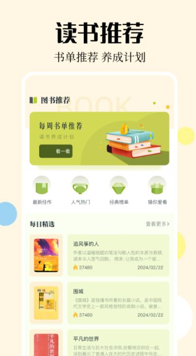 除此之外,星星閱讀還通過智能推薦功能為用戶提供個性化的圖書推薦。根據(jù)用戶的閱讀偏好和興趣標(biāo)簽,應(yīng)用程序會推薦相關(guān)作者、類別或主題的小說作品,幫助用戶發(fā)現(xiàn)新作品,并擴(kuò)展他們的閱讀領(lǐng)域。