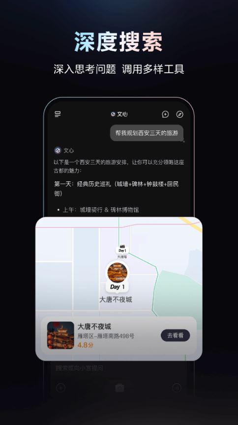 當(dāng)你碰到問題,只要你有需求,即刻獲得為您定制的回答。搜地圖導(dǎo)航,搜休閑音樂,搜高清圖片,搜專業(yè)百科,搜表格導(dǎo)圖,什么都能搜!提問不設(shè)限,問文檔,問圖片,問對話,怎么問都可以!