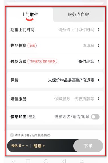 3、選擇上門取件,然后填寫詳細(xì)的期望上門時(shí)間、物品信息、付款方式、增值服務(wù),勾選請(qǐng)閱讀《電子運(yùn)單契約條款》,再點(diǎn)擊下單即可。