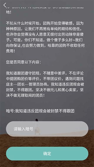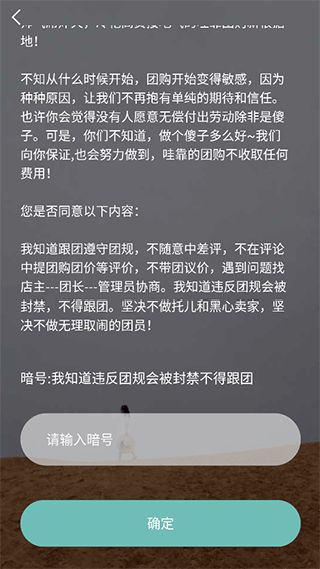 3、在這里輸入暗號內(nèi)容:“我知道違反團規(guī)會被封禁不得跟團”,然后點擊“確定”按鍵;