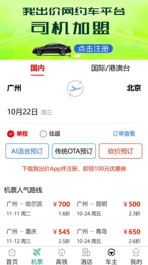 我出價(jià)app是一款機(jī)票酒店預(yù)訂服務(wù)軟件,致力讓用戶的出行更加的方便快捷。用戶通過(guò)軟件可以快速查看相關(guān)機(jī)票、火車、汽車票的價(jià)格,并且在線購(gòu)買,快速搶到票,避免后面買不到票的尷尬。還可以查詢酒店,輸入目的地就能查詢其所有的酒店信息,在線預(yù)訂,幫助用戶解決出行住宿的問(wèn)題。