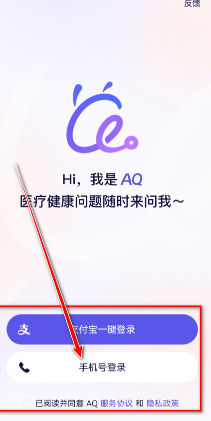 1、打開AQ,可以看到本軟件支持支付寶一鍵登錄或者手機號登錄,在這里小編以點擊手機號登錄為例。