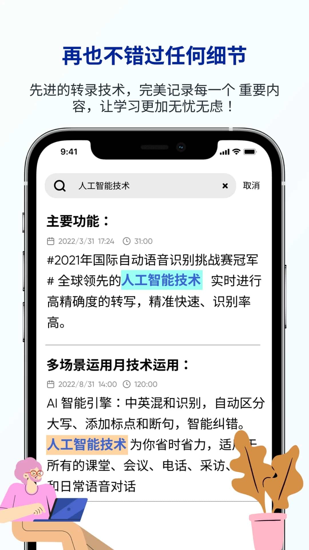 * 實(shí)時(shí)轉(zhuǎn)寫:為你實(shí)時(shí)記筆記、錄語音,準(zhǔn)確度高;結(jié)束后自動保存文字和語音記錄。